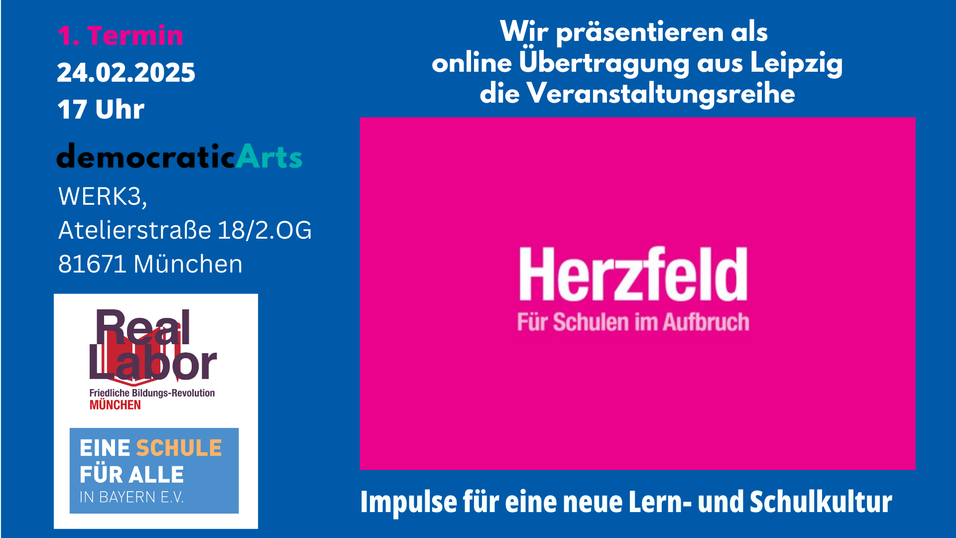democraticArts Atelier Atelierstraße 18/2.OG (Werk 3), MünchenIm Februar macht das RealLabor Leipzig in Kooperation mit Schule im Aufbruch den Auftakt zur Online-Veranstaltungsreihe Herzfeld! Die Herzfeld-Reihe zeigt Lernformate, die Schulen entlang der vier UNESCO-Säulen des Lernens weiterentwickeln: Wissen erwerben, handeln, zusammenleben und sein. Projektbasiertes Lernen, Verantwortung übernehmen und Lernen durch Engagement stehen im Mittelpunkt. In Kooperation mit democraticArts überträgt das RealLabor München alle Veranstaltungen der Reihe und schafft Raum für anschließenden Austausch.