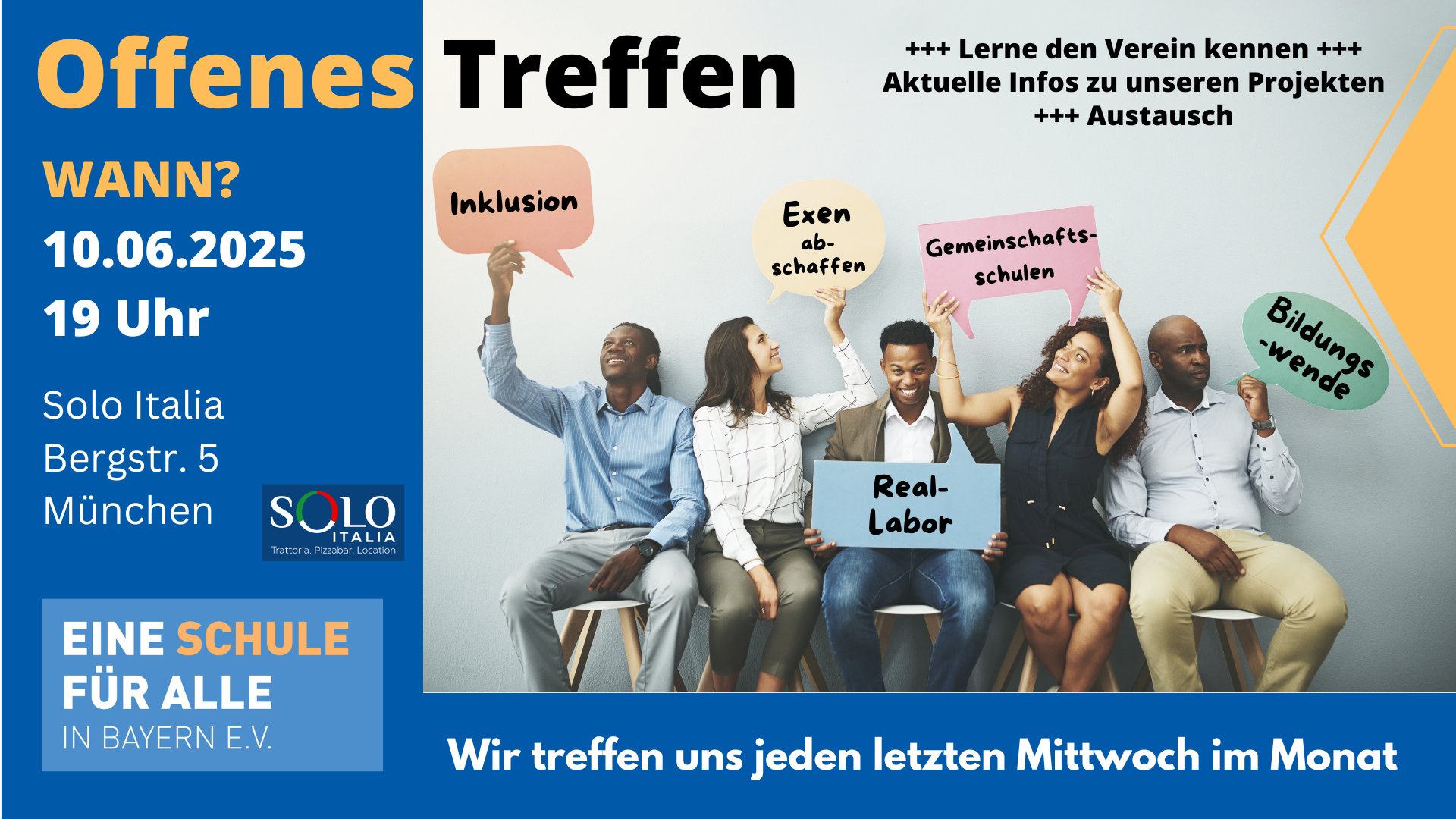 Solo Italia Bergstrasse 5, MünchenEingeladen sind alle Interessierten, Eltern, Lehrerinnen, Schülerinnen und Student*innen, die sich für eine positive Veränderung an unseren öffentlichen Schulen einsetzen möchten. Unser Ziel ist eine Schule, die durch eine gute Lernkultur, Inklusion und Freude am Lernen überzeugt, sowie das Ziel Gemeinschaftsschulen in Bayern als zusätzliche Schulart auf den Weg zu bringen. ✉️ Anmeldung: Bitte meldet euch unter info@eine-schule.de an.