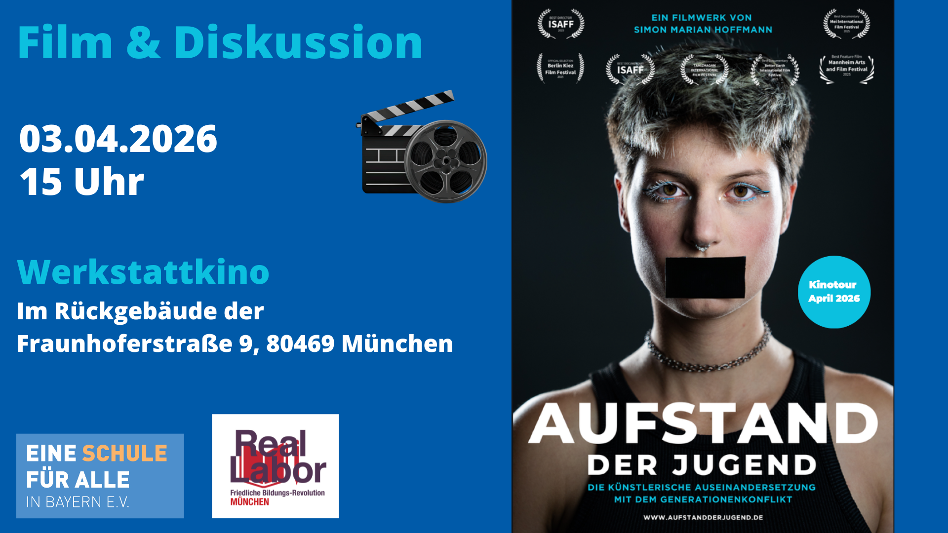 Werkstattkino München m Rückgebäude der Fraunhoferstraße 9, MünchenFilmvorführung im Werkstattkino München am 3.4.2026: Aufstand der Jugend. Mit anschließender Diskussion zusammen mit dem Filmregisseur Simon Hofmann und Protagonist*innen aus der Dokumentation. Die Vorführung beginnt um 15:15 Uhr (Einlass ab 15:00 Uhr), Filmende ca. 16:45 Uhr. Ab 17:00 Uhr: Die Film-Nachbesprechung und der Austausch findet um die Ecke im Hotel Olympic stattfinden. Der Weg vom Werkstattkino zur Hans-Sachs-Straße 4 (Hotel Olympic) dauert 5 Geh-Minuten. Ende um ca. 19 Uhr; Eintritt: 10 Euro, bitte direkt vor Ort bezahlen. Aufstand der Jugend ist mehr als ein Film – er ist das künstlerische Echo einer Generation im Aufbruch. Ein visuelles Manifest. Eine politische Ansage. Und ein leidenschaftlicher Appell, die Stimmen jener zu hören, die alle Konsequenzen heutiger Entscheidungen tragen.